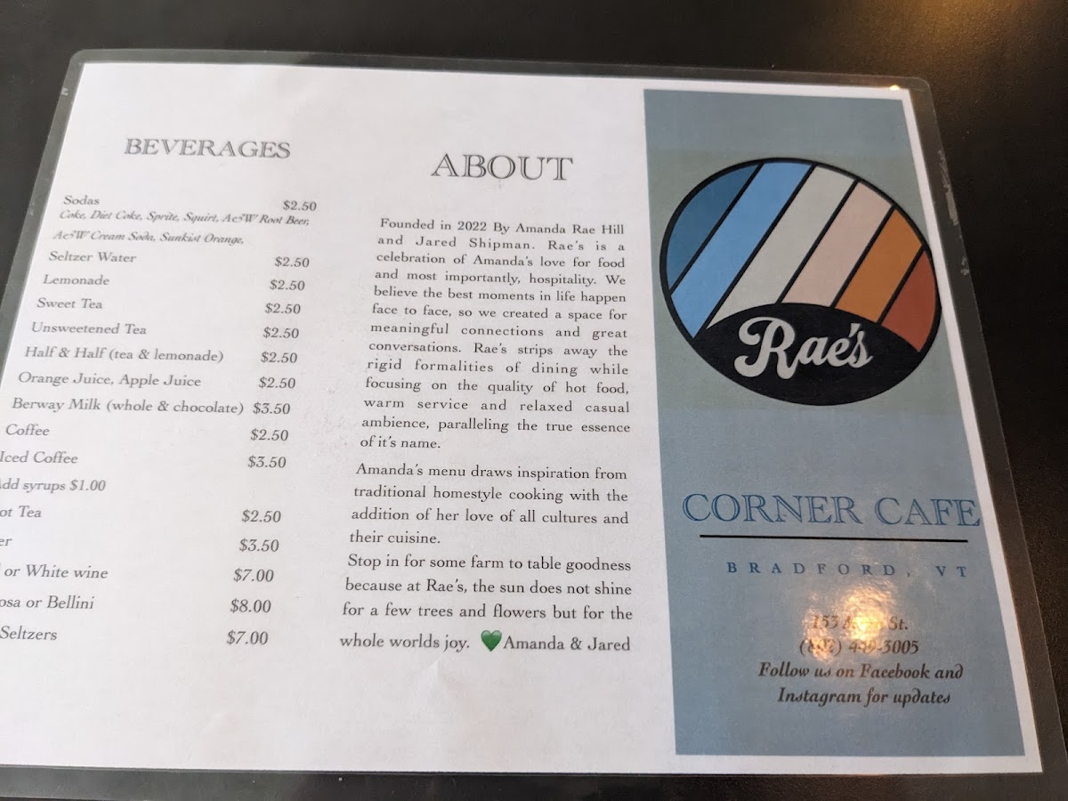 Rae’s Corner Cafe Menu